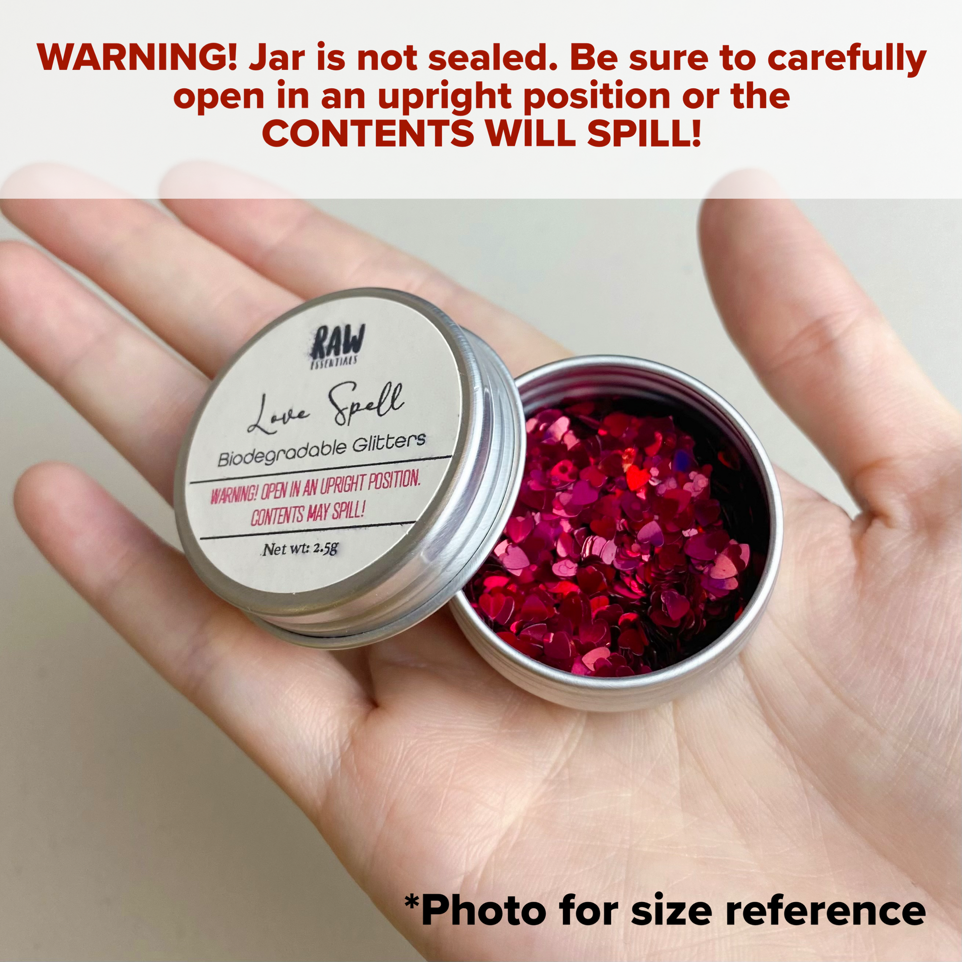 IMPORTANT NOTE: PLEASE BE SURE TO OPEN THE JAR IN AN UPRIGHT POSITION TO AVOID SPILLING THE CONTENTS. WE CANNOT STRESS THIS ENOUGH.